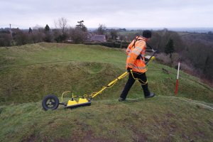 GPR at Castle Pulverbatch: Castle Pulverbatch is recognised as one of the finest examples of a motte and bailey castle in the county. In 2017 a programme of geophysical survey and UAV survey at Castle Pulverbatch, funded by the Castle Studies Trust, took advantage of recent scrub clearance by the Friends of Castle Pulverbatch. Detailed resistivity and magnetometry survey was undertaken of all available areas in both the inner bailey on the northeast side of the motte, and the large outer bailey that lies to the northwest. This work was supplemented in 2018 by a ground penetrating radar (GPR) survey supported by a grant from the Shropshire Archaeological and Historical Society. Analysis of the results suggest in situ building material, particularly within the inner bailey, coinciding with earthwork features seen on the drone survey. The results of this study have been published in the latest Transactions (vol. 93 for 2018, pp31-44). Recent survey work at Caus Castle and Castle Pulverbatch