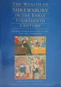 D & R. Cromarty, (eds.) The Wealth of Shrewsbury in the Early Fourteenth Century: Six Local Subsidy Rolls 1297 to 1322: Text and Commentary, 1993, ISBN 0 9501227 3 5. 125 pp. Shrewsbury is fortunate to have six local subsidy rolls, a number greater than for any other town. They record the assessment of the taxpaying population’s wealth from 1297 to 1322. The rolls consist of lists of names followed by inventories of taxed goods, a summation of their values and then the tax due as a fraction which the Crown demanded. The authors have looked into the historical background of the taxes at local and national levels, and have used the evidence of the inventories to discuss the social structure of the town and its economy.